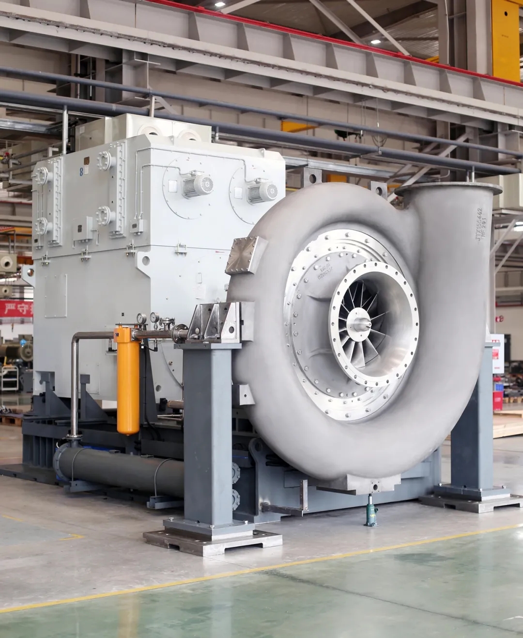 作為江增重工研制生產的大功率懸臂式高速離心式蒸汽壓縮機,HGC8000蒸汽壓縮機重量達65T、主電機功率8200kW、蒸汽處理量200T/h,是公司研制的目前裝機功率最大、蒸汽處理流量最大、單機噸位最重的一臺蒸汽壓縮機。